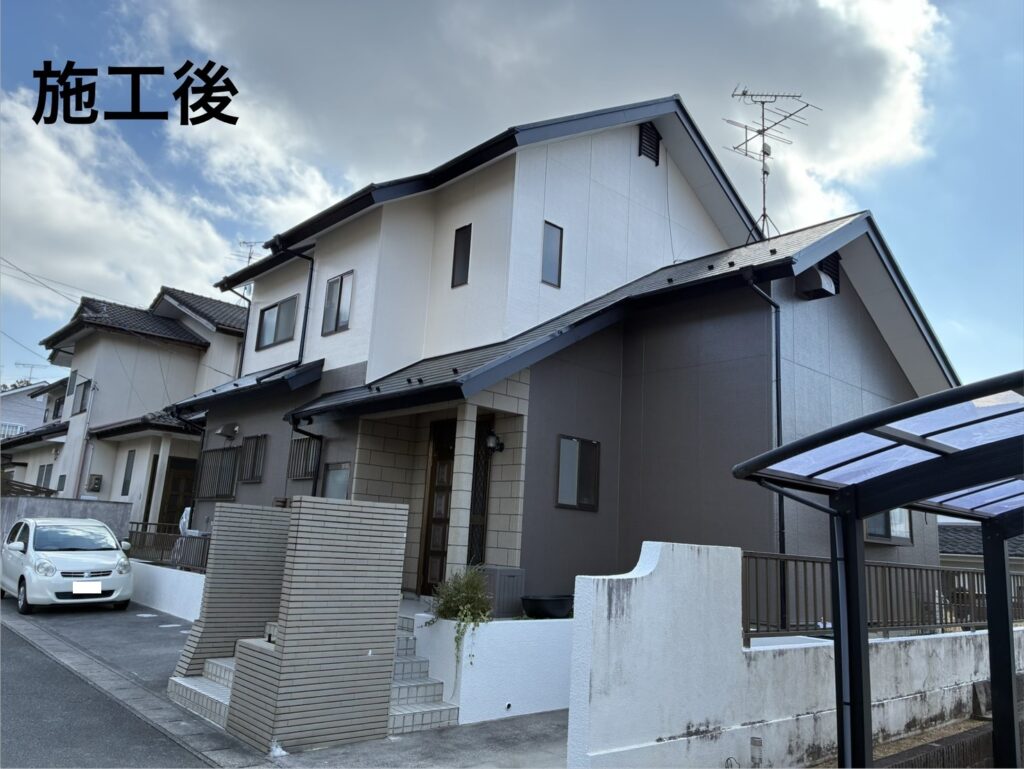 外壁の剥がれ、チョーキングが発生していました。しっかり下地処理を行った上で塗装し、破風についてはもともと木製で傷みがありましたので板金でカバーさせていただきました。