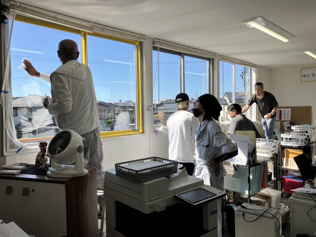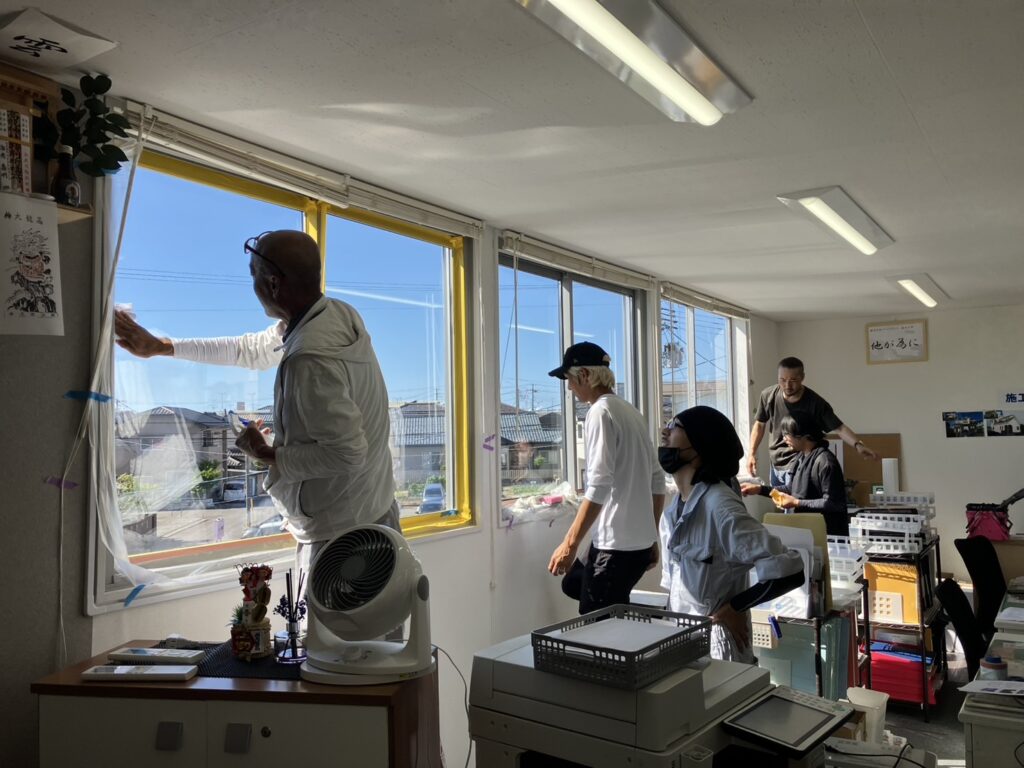お盆休み前従業員の皆さんと社屋のガラスに遮断熱塗料を塗装しました、