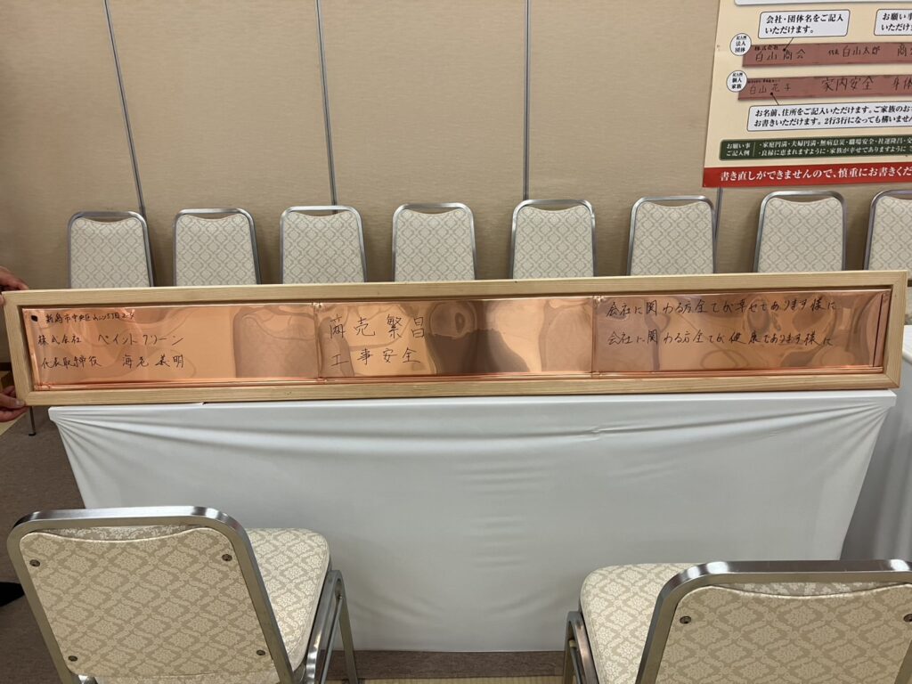 目的は67年ぶりに行われる本殿の屋根の葺き替え工事の際に使われる銅板を奉賛させて頂きに参りました。