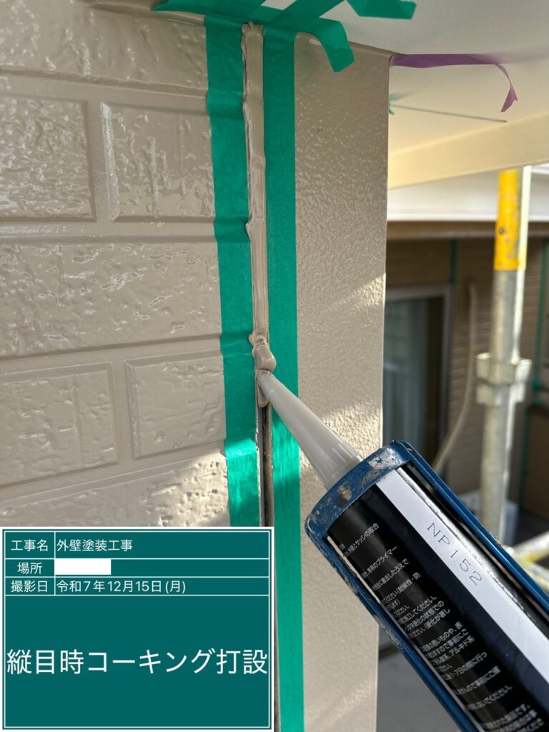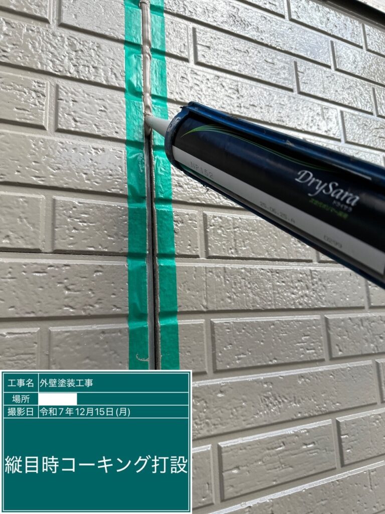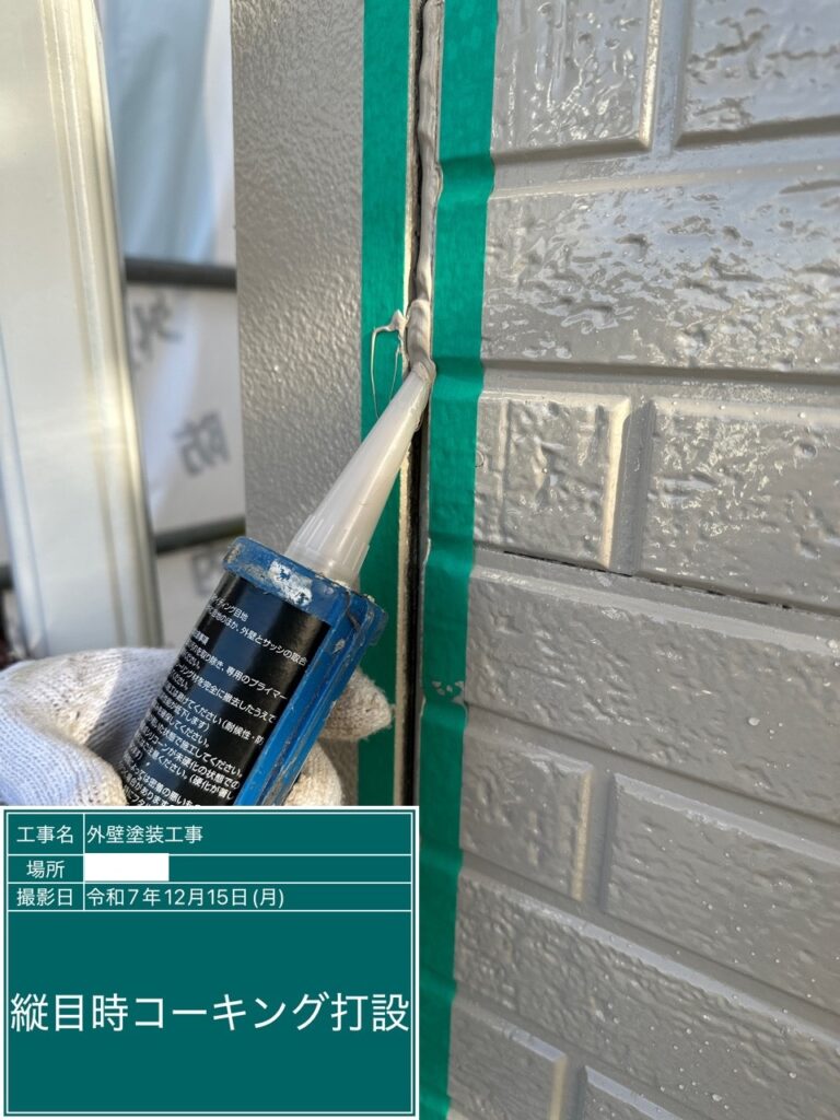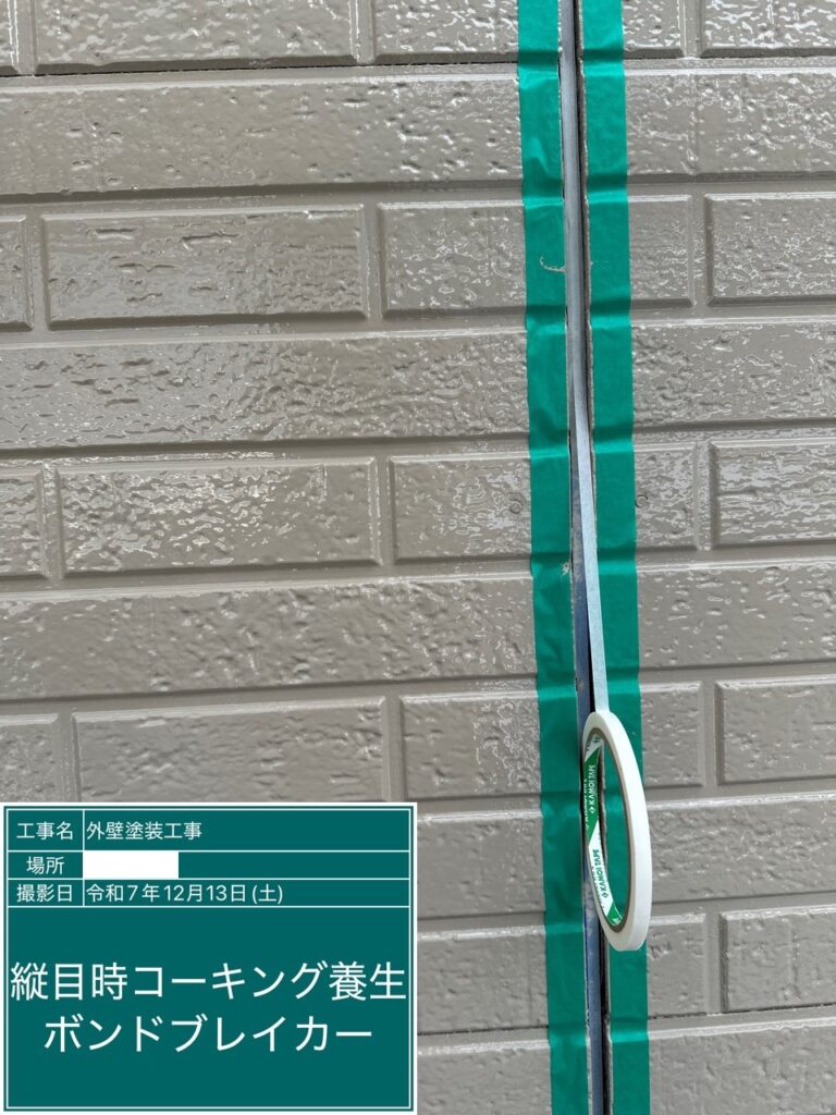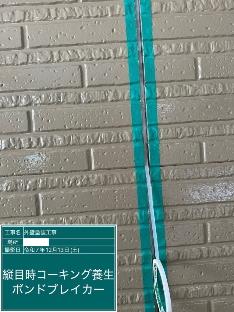 コーキングの工程で重要なボンドブレーカー打設。これはコーキングの3面接着を防ぎ、2面接着させることでコーキングの柔軟性を保ちます。3面接着してしまうと外壁材の動きについていけず、ひび割れが起きてしまいます。ここから雨水が侵入し雨漏りに繋がるケースがあります。